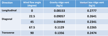 The discharge rates of gravity ridge vents and Venturi box ridge vents were analyzed across various wind flow angles. The results are summarized below: